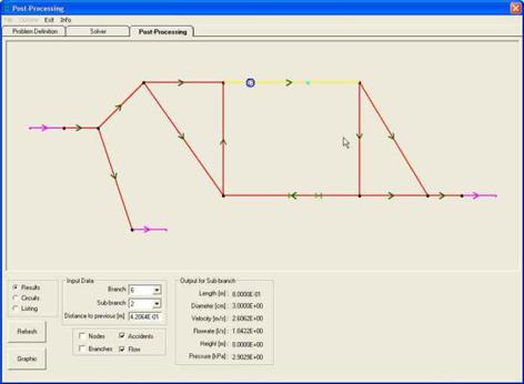 After the solution, values for the flowrate, pressure, and flow velocity are available at each location of the network.
