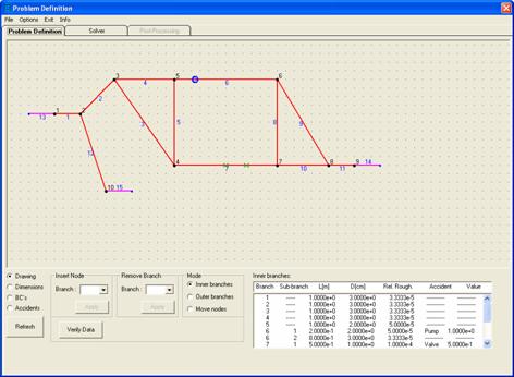 · Flowrate problem: in this case, the entire network is specified in terms of pipe diameter, length and roughness, as well as pumps, valves and turbines characteristics. The goal is to find the flowrate in every branch. · Dimensioning problem: pump or turbine characteristics or network dimensions are computed so as to achieve a specified flowrate in a certain branch.